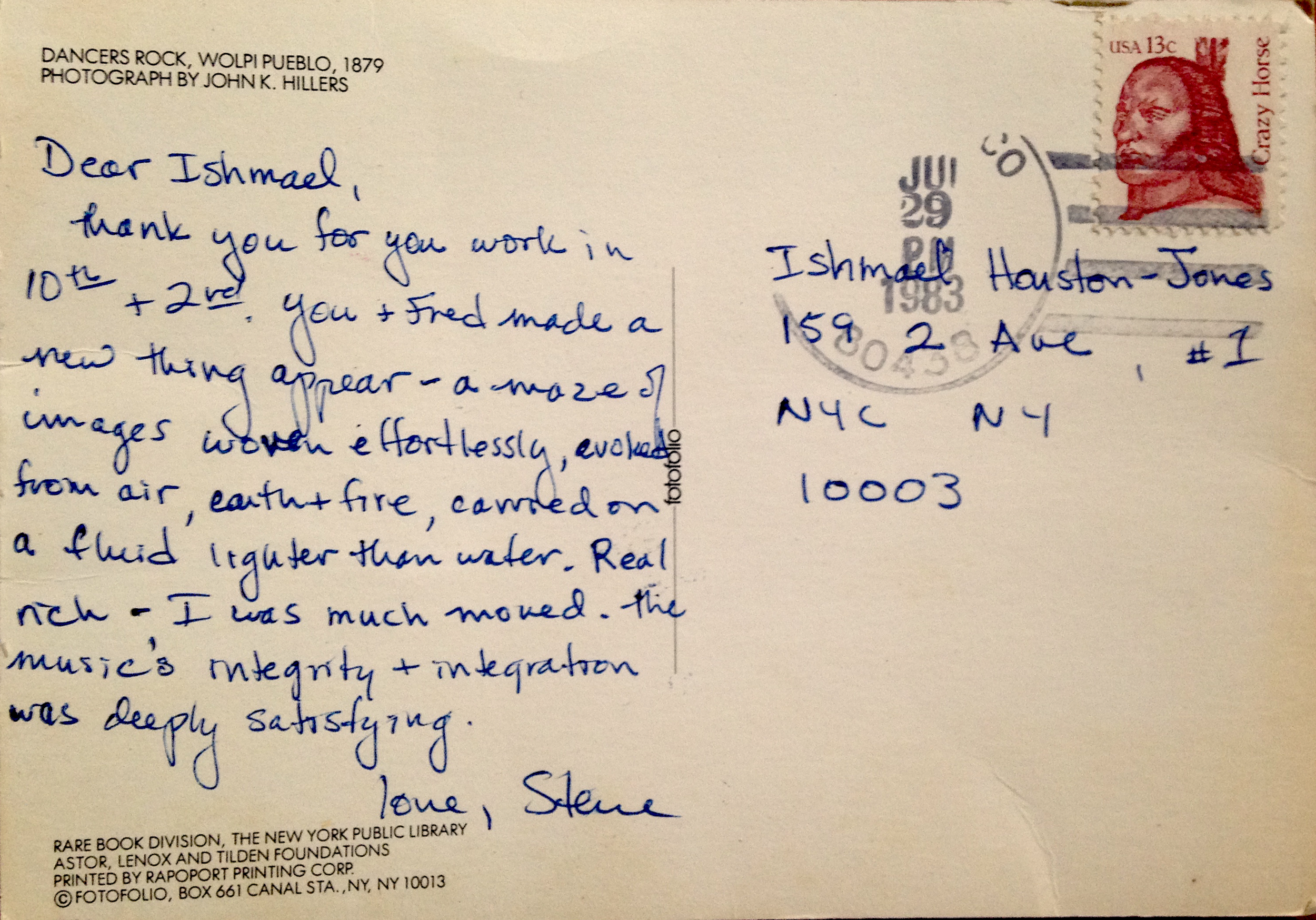 Steve Paxton sent this postcard on June 29, 1983 after Fred Holland and Ishmael Houston-Jones had performed their Untitled Duet, sometimes called Oo-Ga-La on the “Partners” program at Contact at 10th and 2nd Festival at Danspace Project.
